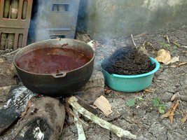 The “thread” fiber is obtained from wild Chunga palm leaves and colorfully dyed with extracts of plant leaves, bark and mud. First, the membrane part of the leaves is skinned off, and then roughly split into threads. The threads are then dried under the sun and cooked with plant juices in order to be to dyed to the correct color.