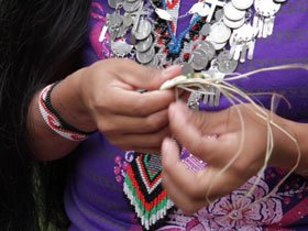 The weaver starts a basket by tying a knot with a bundle of nahuala fibers. She stitches around the knot with a needle and Chunga thread to create the bottom center of the basket. As she coils the bundles around the knot, she secures the coil by sewing the thread around the coil to a stitch of the previous coil. She continues this spiraling and stitching technique to create the basket. By using different colors of thread she creates a design on the basket.