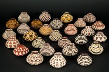 In general, you will find higher stitch count in smaller baskets. The big basket stitch count is about 300 to 400 stitches per square inch vs the smaller ones can have about 600 to 1000. To achieve a finer or higher stitch count basket, the weaver not only splits the thread thinner but also uses a smaller bundle of nahuala fibers.